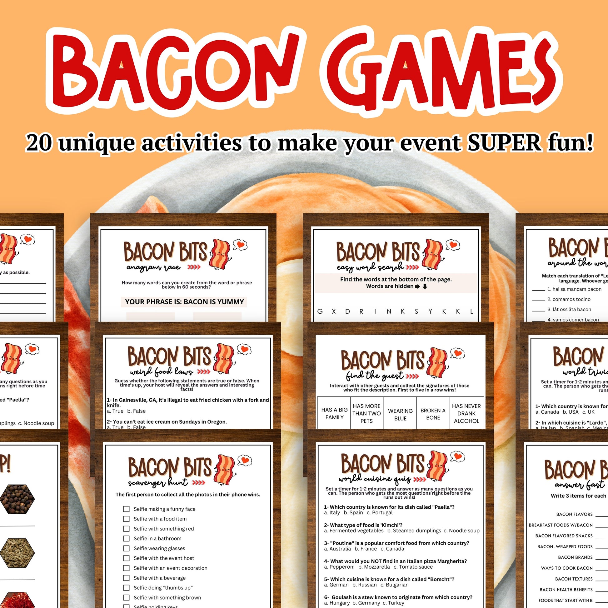 This MEGA bundle of 20 bacon and food-themed games from Party Prints Press is just what you need!