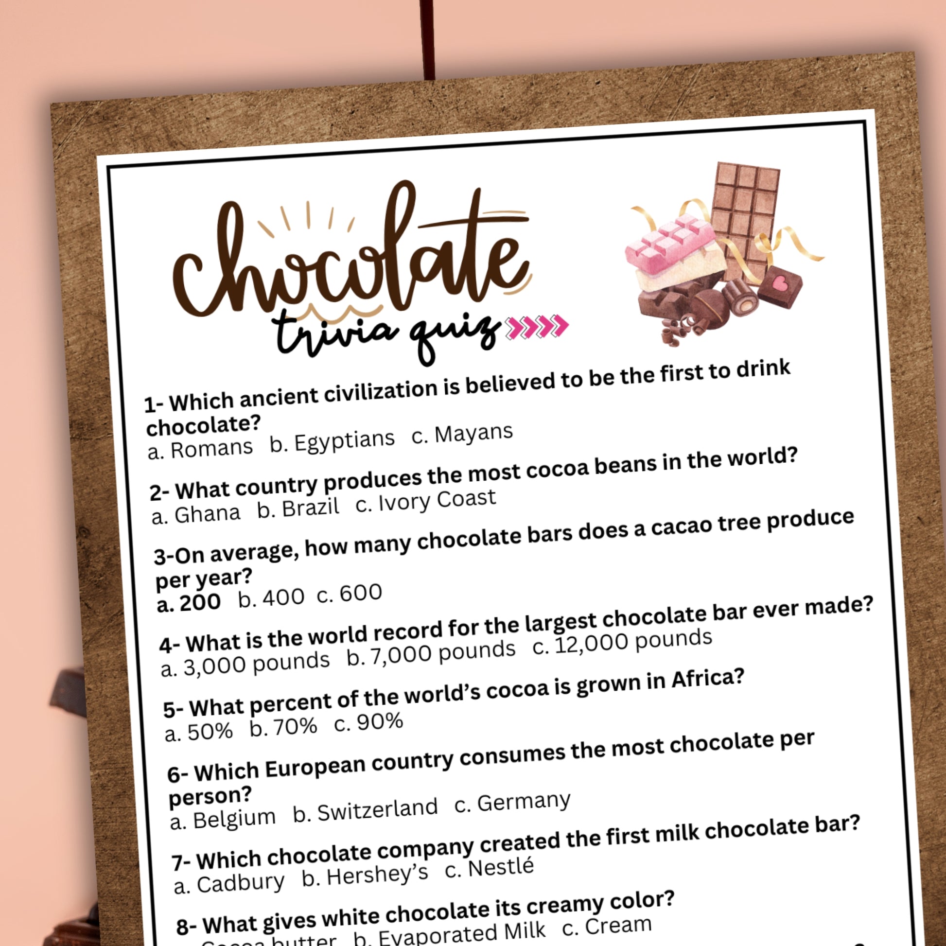Whether you're hosting a Valentine's Day celebration, a Christmas hot cocoa bar, a candy fondue party, or a chocolate-themed birthday bash, this printable trivia game will test everyone's knowledge of chocolate history, fun facts, and surprising stats.