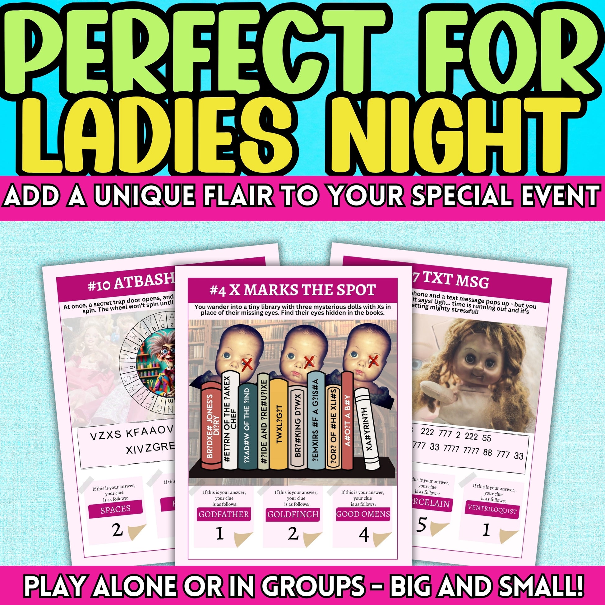 The Dollhouse Escape Room is a printable game designed for immersive play at gatherings like Halloween parties, slumber parties, girls' nights, and bachelorette parties. It features a compelling storyline and a series of ten creatively linked puzzles, each flowing logically to the next, unraveling the mystery as you move from room to room within the dollhouse.