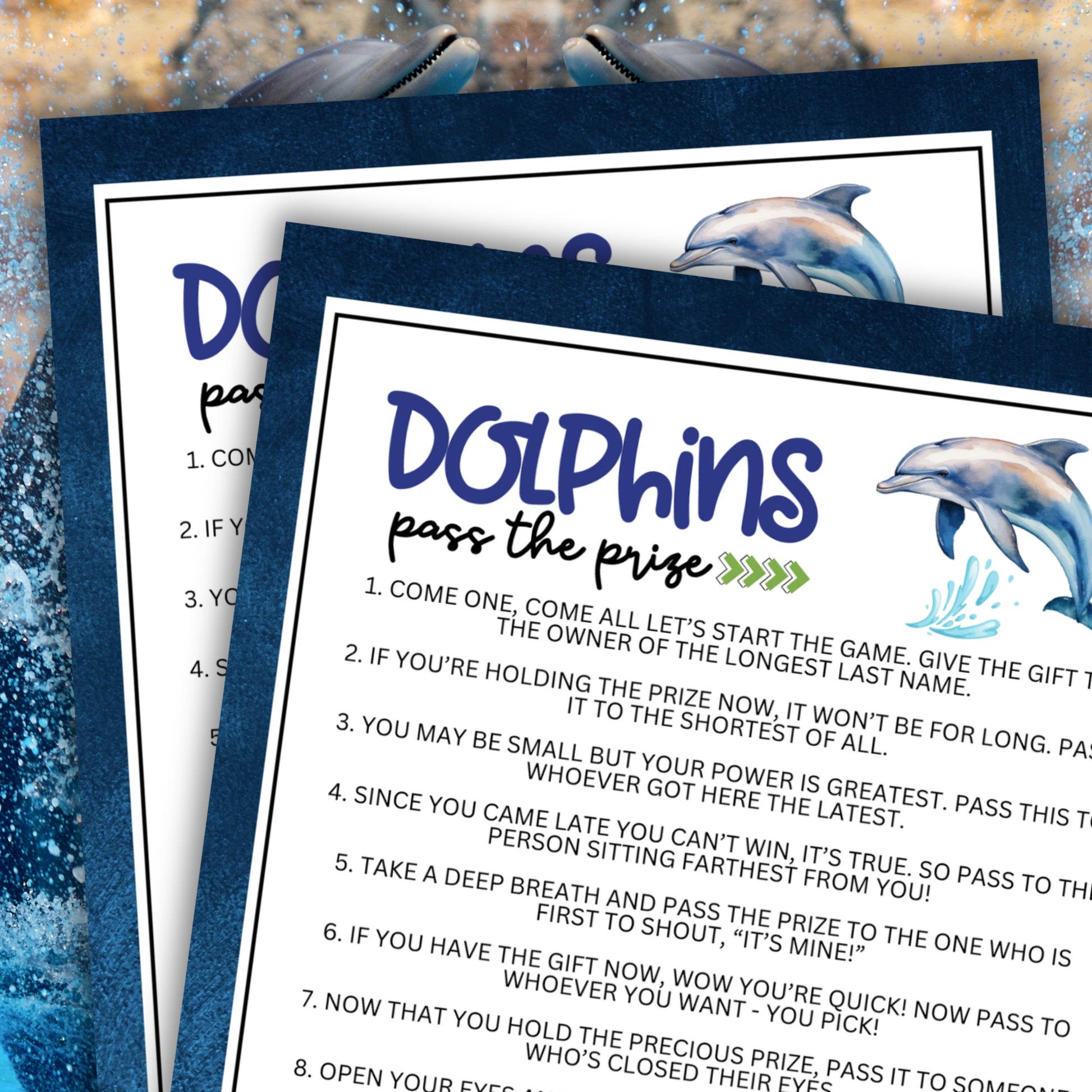 The game features a simple, dolphin-themed story that you can read aloud or print for guests to follow along.