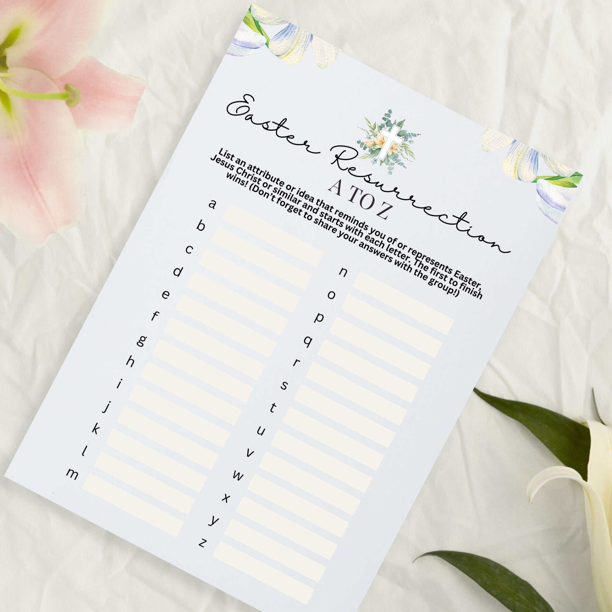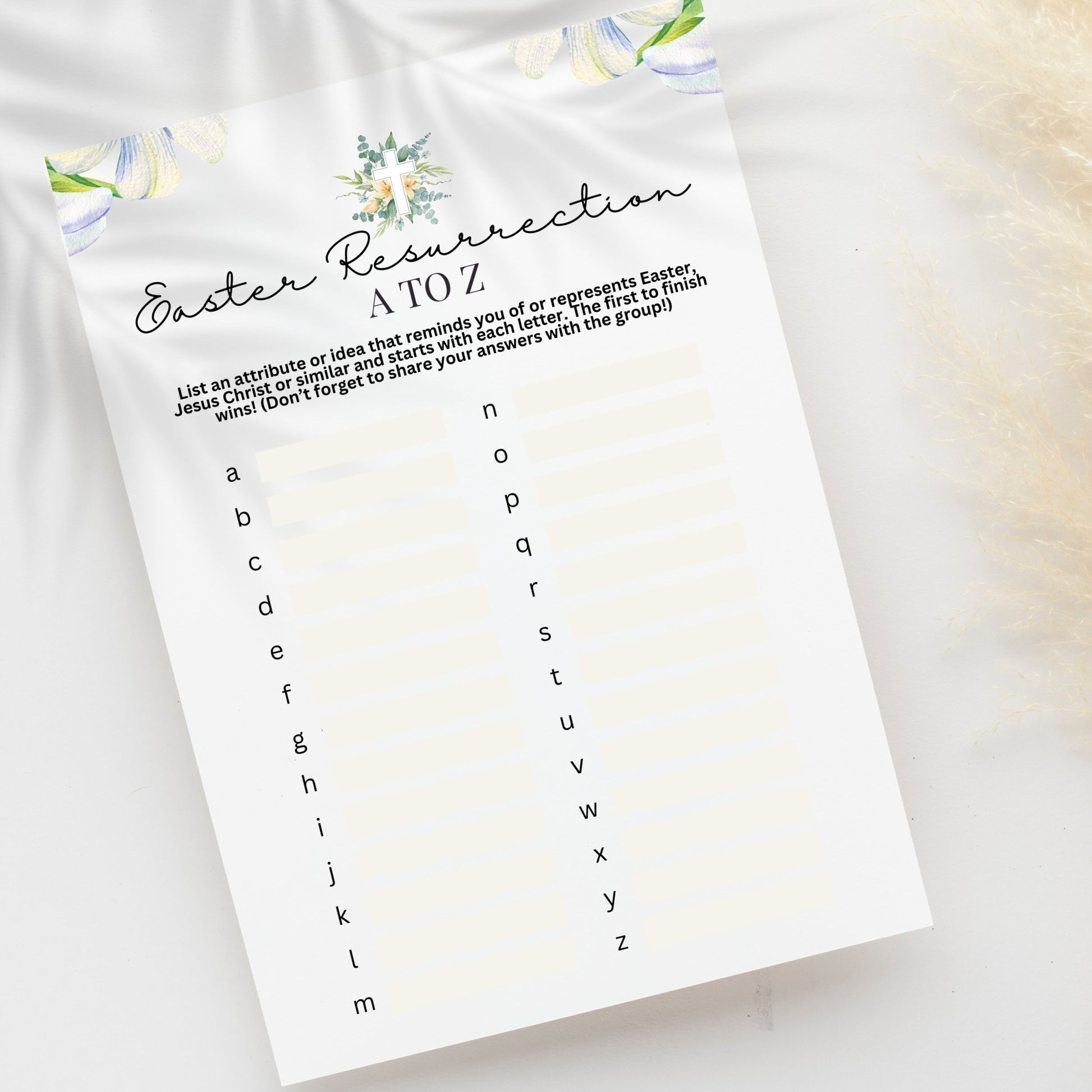 Guests are challenged to come up with as many Easter, Christian, or Biblical words starting with each letter from A to Z.