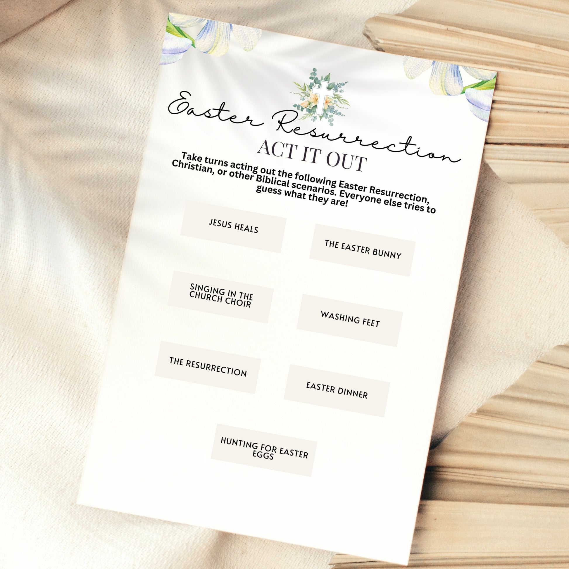 Guests take turns choosing the actor or actress, while everyone else guesses which Biblical, Easter, or related theme they are trying to portray.