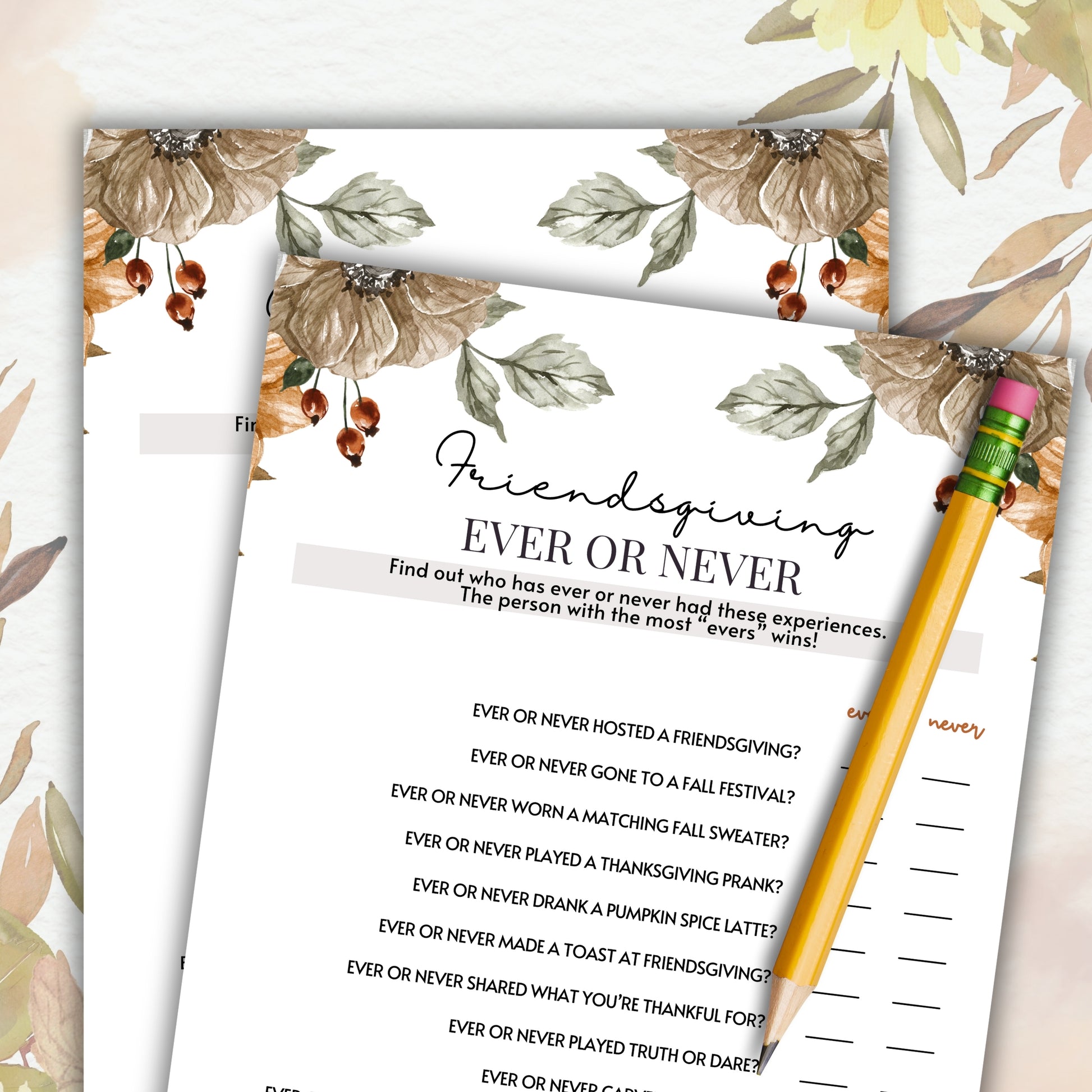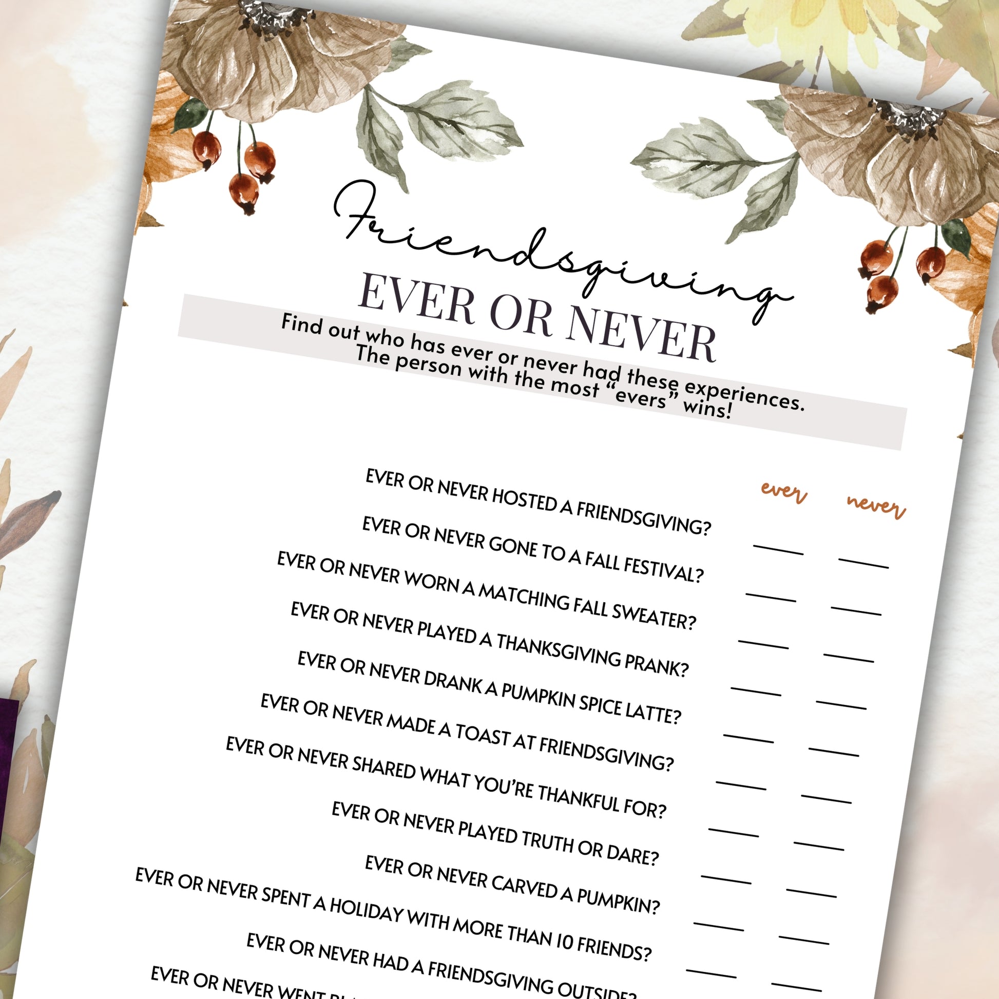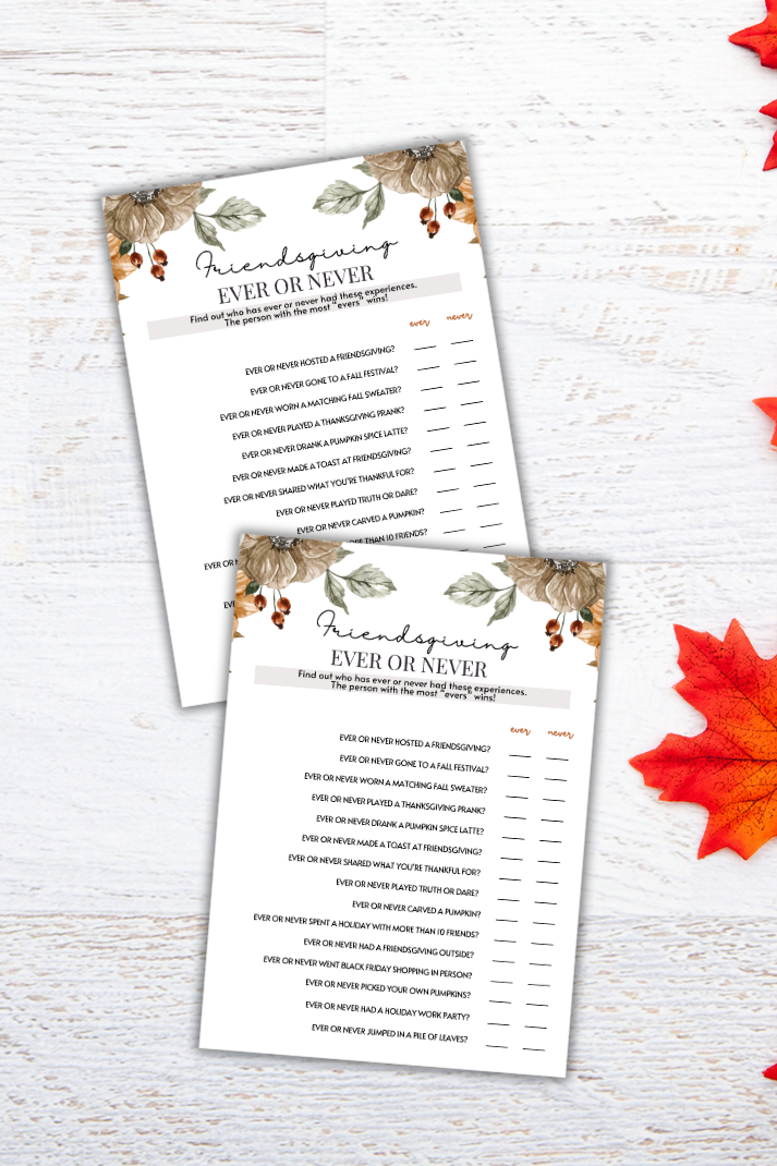 Uncover the secrets of your friends and family with the Thanksgiving and Friendsgiving Ever or Never Game! This fun and revealing game is the perfect way to add a dash of intrigue and laughter to your fall or autumn party.