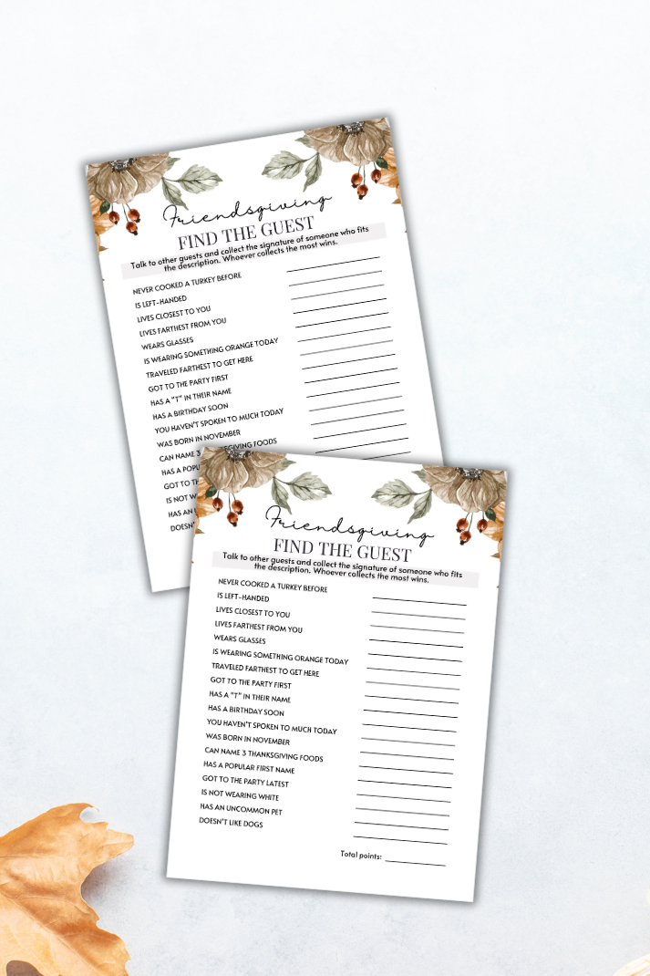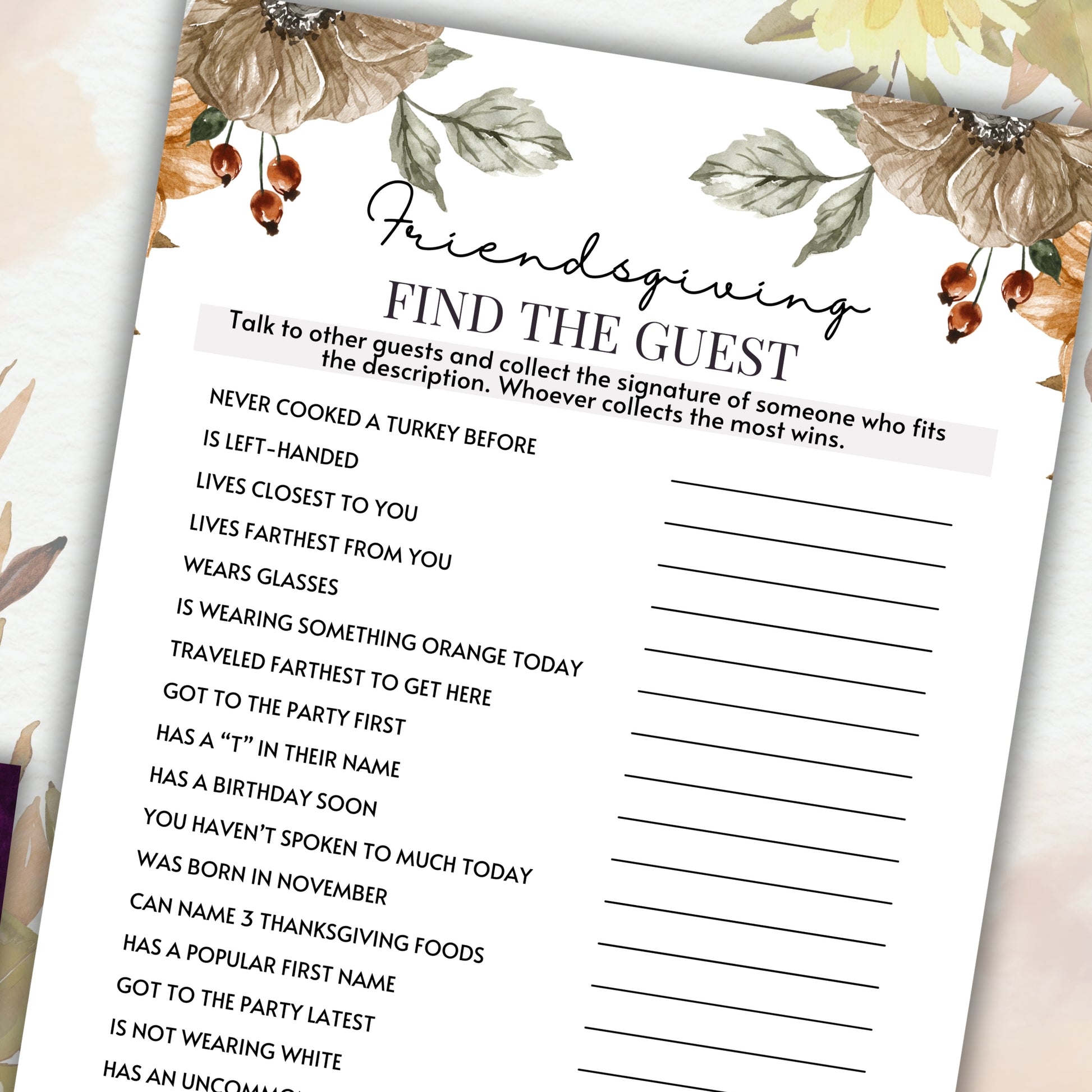 Looking for a fun and easy icebreaker game to play at your Thanksgiving or Friendsgiving Party? This "Find The Guest" printable game from Party Prints Press is just what you need!