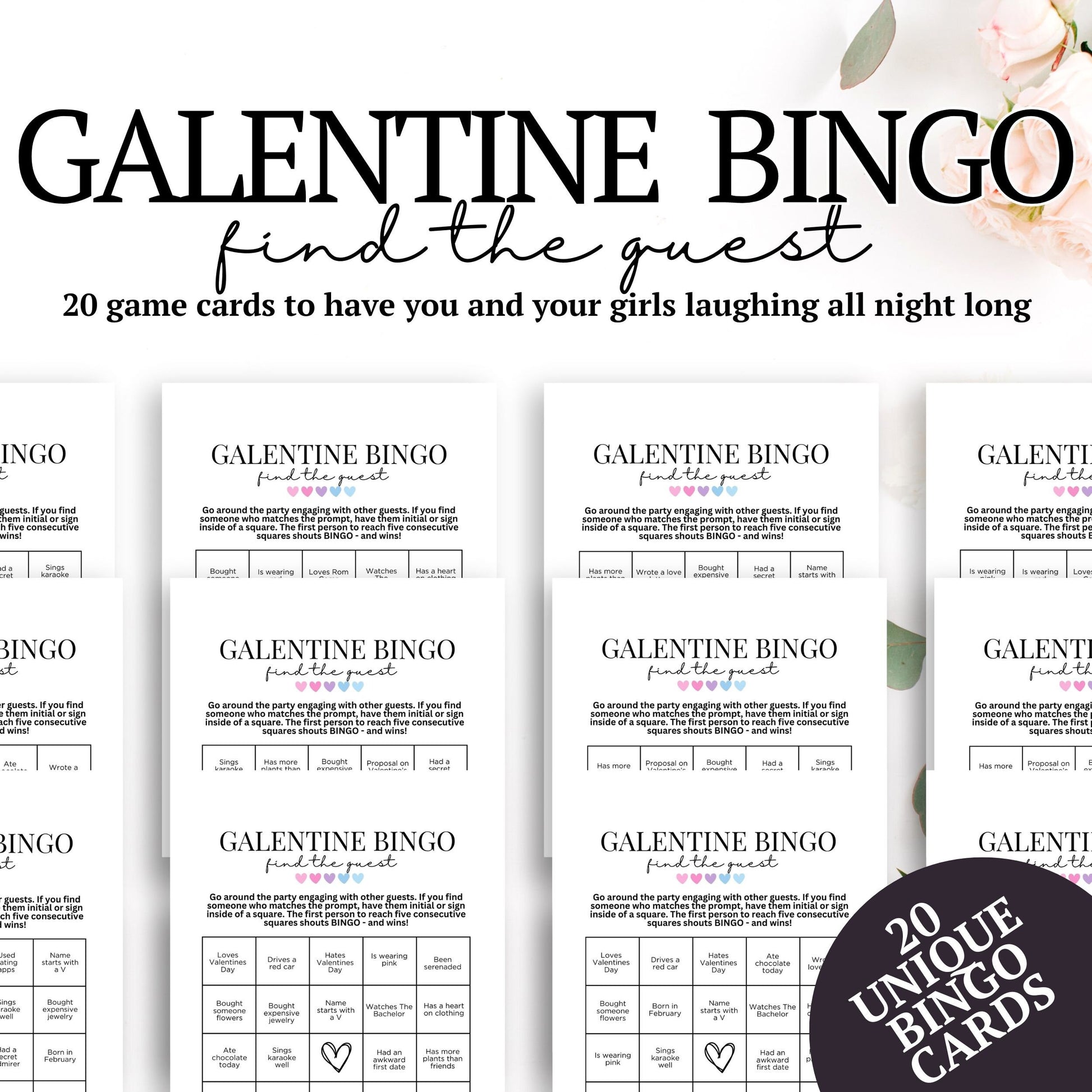 This Galentines Ladies Night Find The Guest BINGO game for adults is perfect for your girls night or Valentine-themed party! Whether you have a small group of best girlfriends or a bigger party, this pack has 20 unique cards so no guest will have the exact same experience.