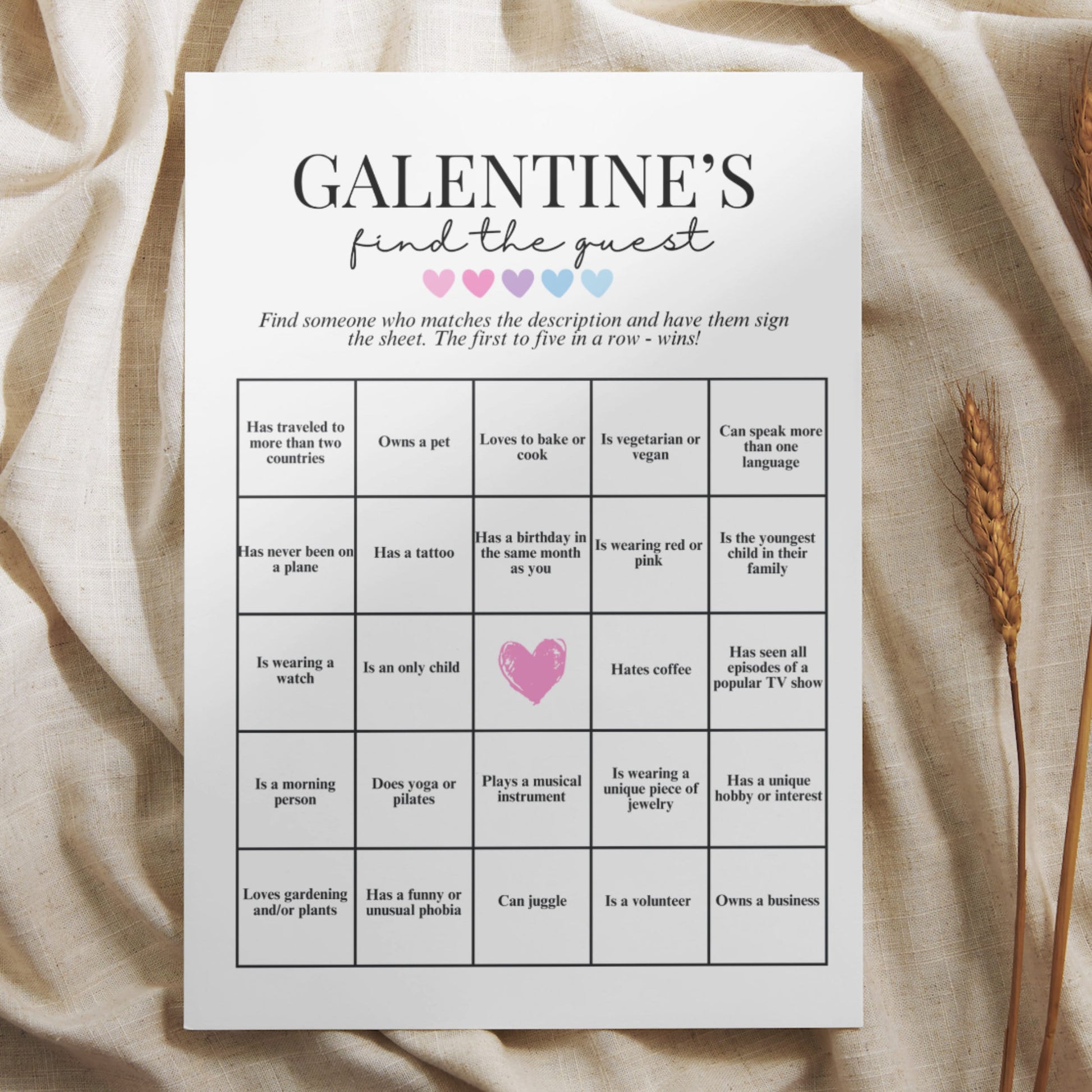 This Galentines Ladies Night Find The Guest game includes a pre-filled card and a blank template that you can fill with your own descriptions.