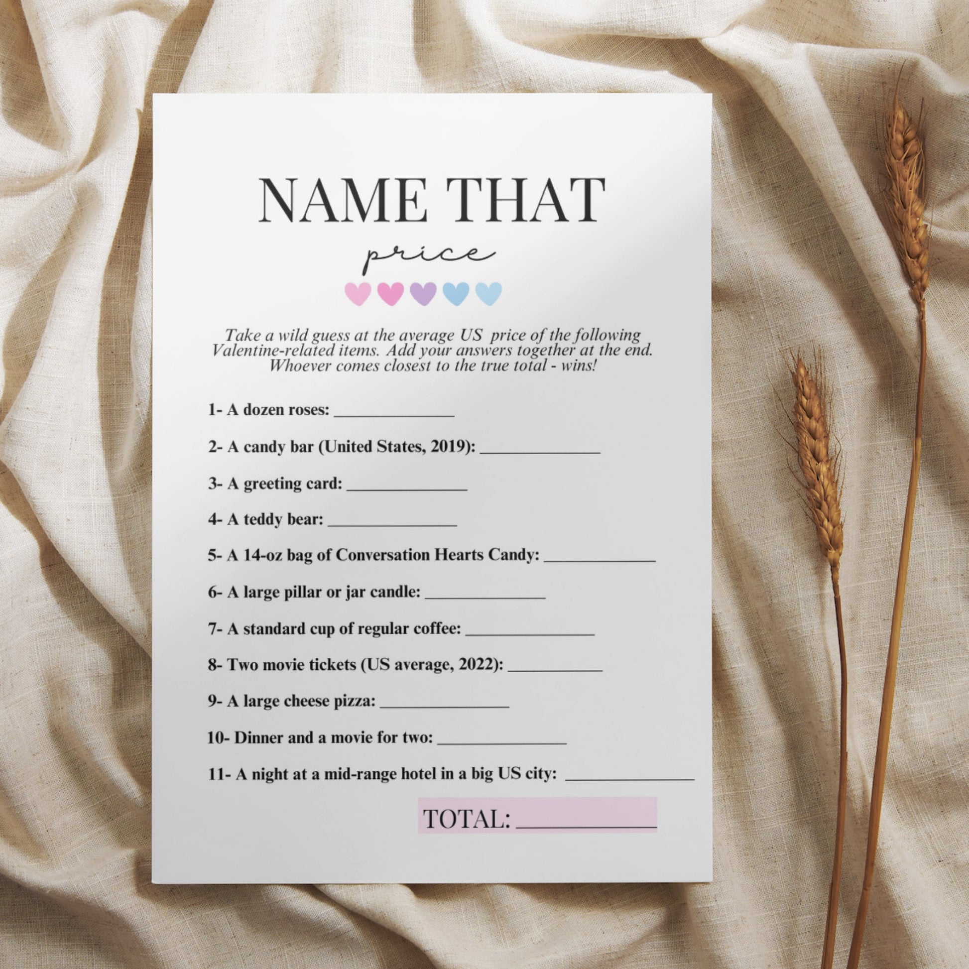 Get ready to spice up your Galentine's Day celebration with this fun and engaging price-matching game! This set features 11 Valentine's and love/romance-themed items and it's your guests' job to guess the average US price of each item, add their estimated total, and whoever comes closest to the actual total price wins!