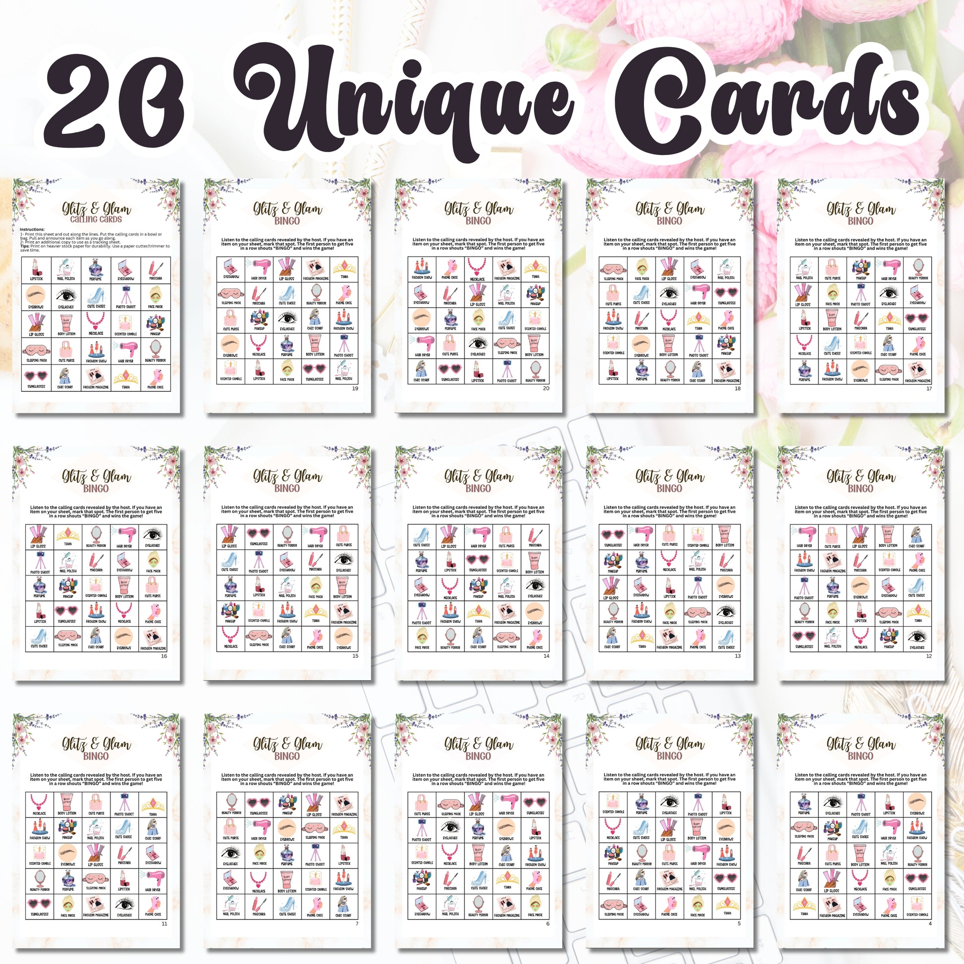 -Fun & Engaging: This bingo game features glamorous items such as lipstick, nail polish, high heels, perfume bottles, and makeup brushes.
