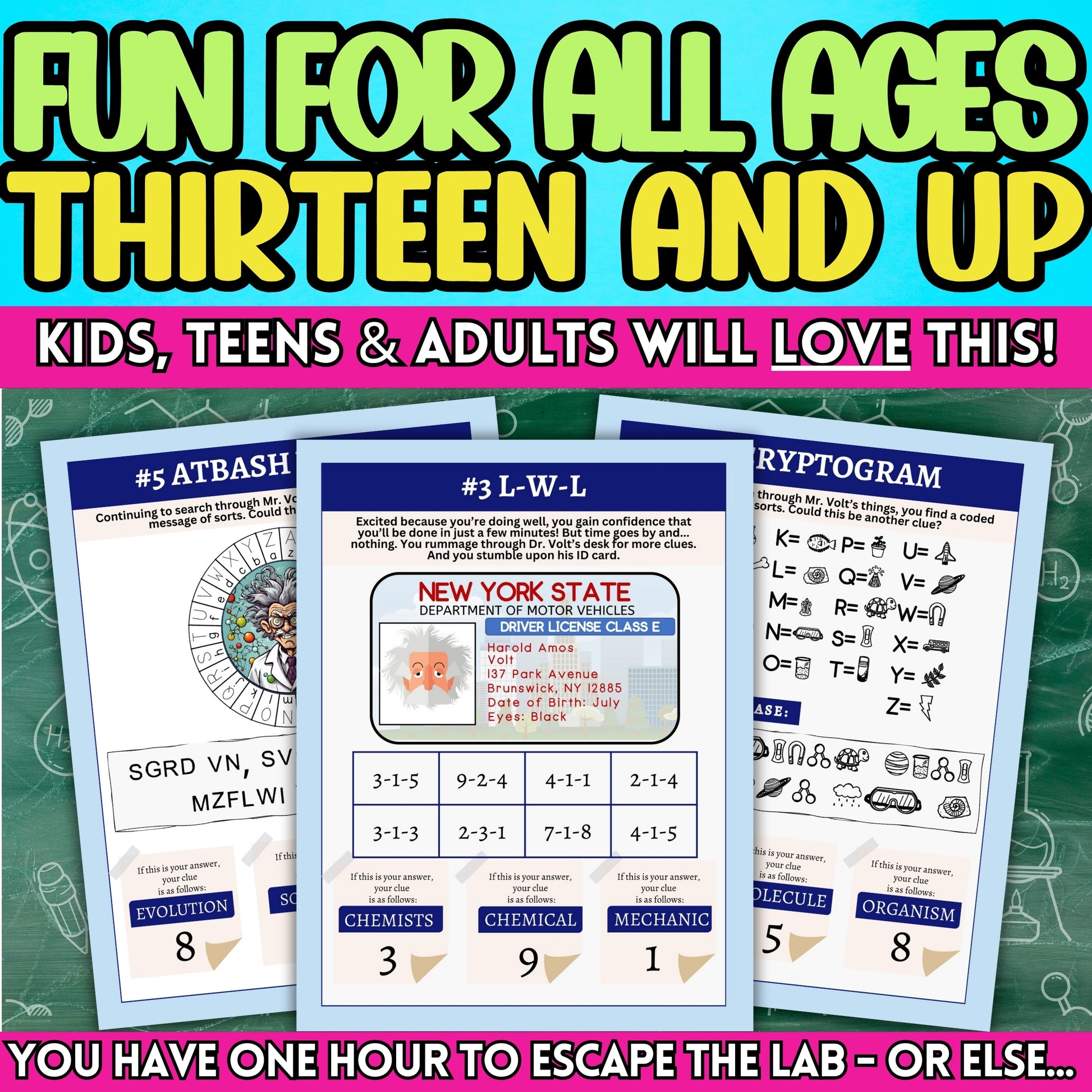 Mr. Volt's Final Test is a downloadable escape room experience that players can enjoy solo or in groups. Upon downloading, you’ll receive a storyline setup, a compelling mission, and a sequence of ten clever puzzles to solve, each revealing the path to escape the science lab. Set it up in minutes and start your adventure with no additional hassle!