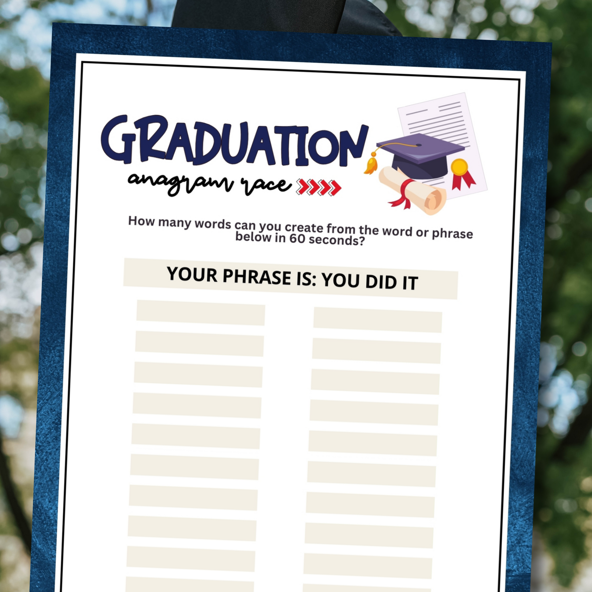 Give each guest a sheet, set a timer, and whoever can create the most relevant smaller words from the larger phrase "You Did It" before time runs out wins the game!