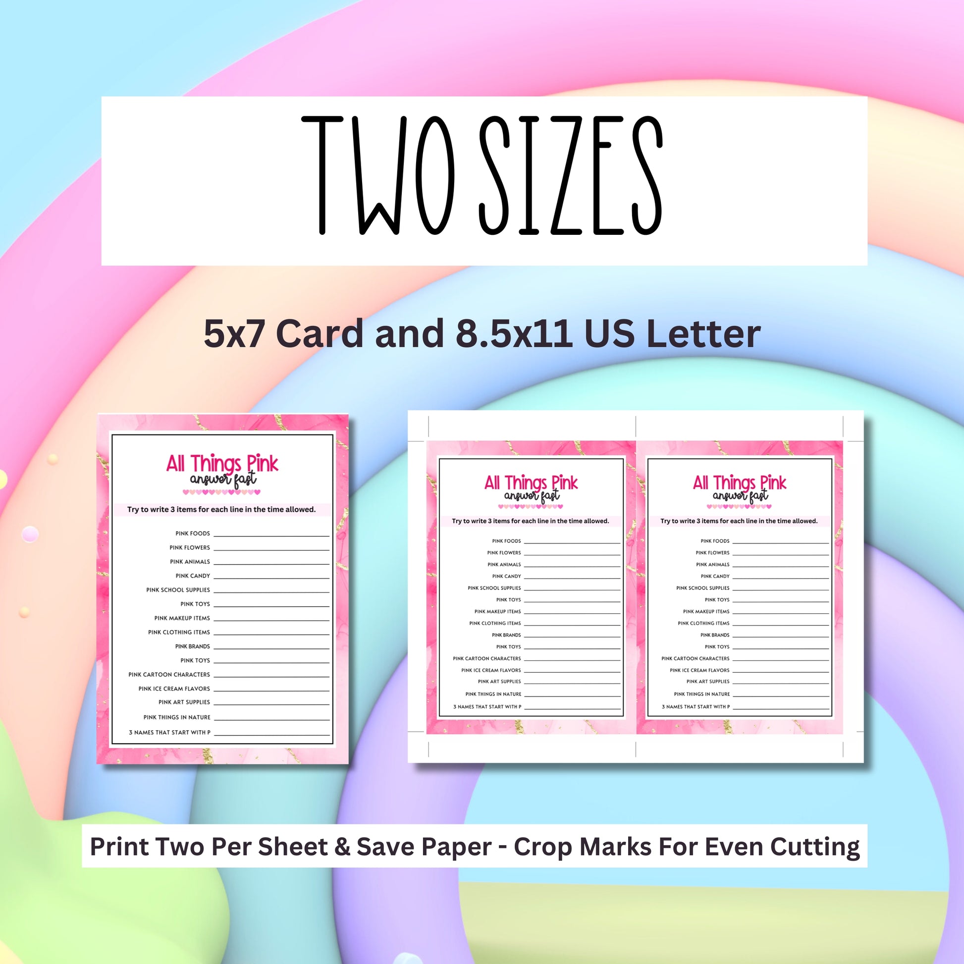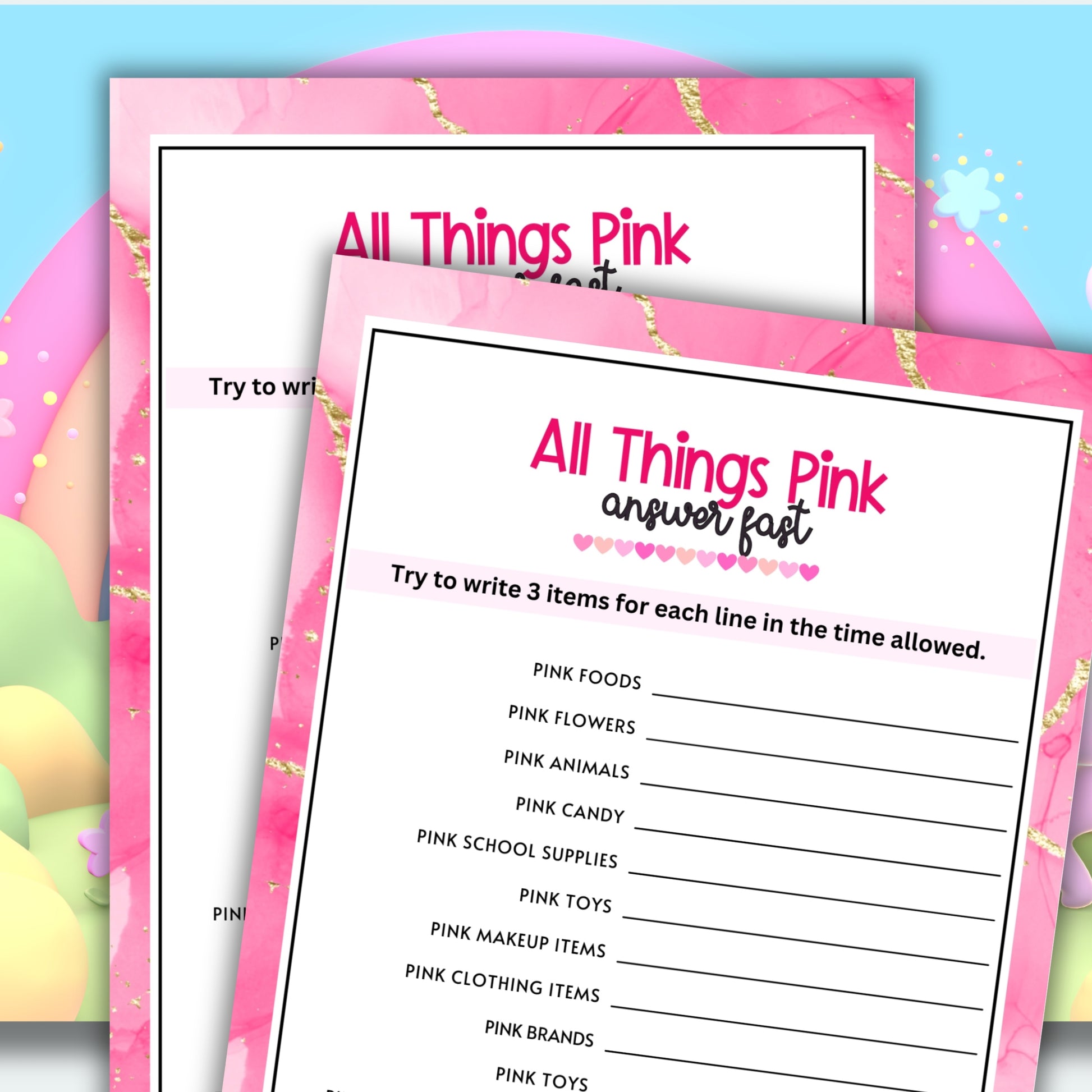 Get ready for a fun and fast-paced game that's all about the color pink! "Answer Fast - Pink Edition" is a lively and engaging printable game perfect for parties, family gatherings, and any event where you want to add a splash of color.