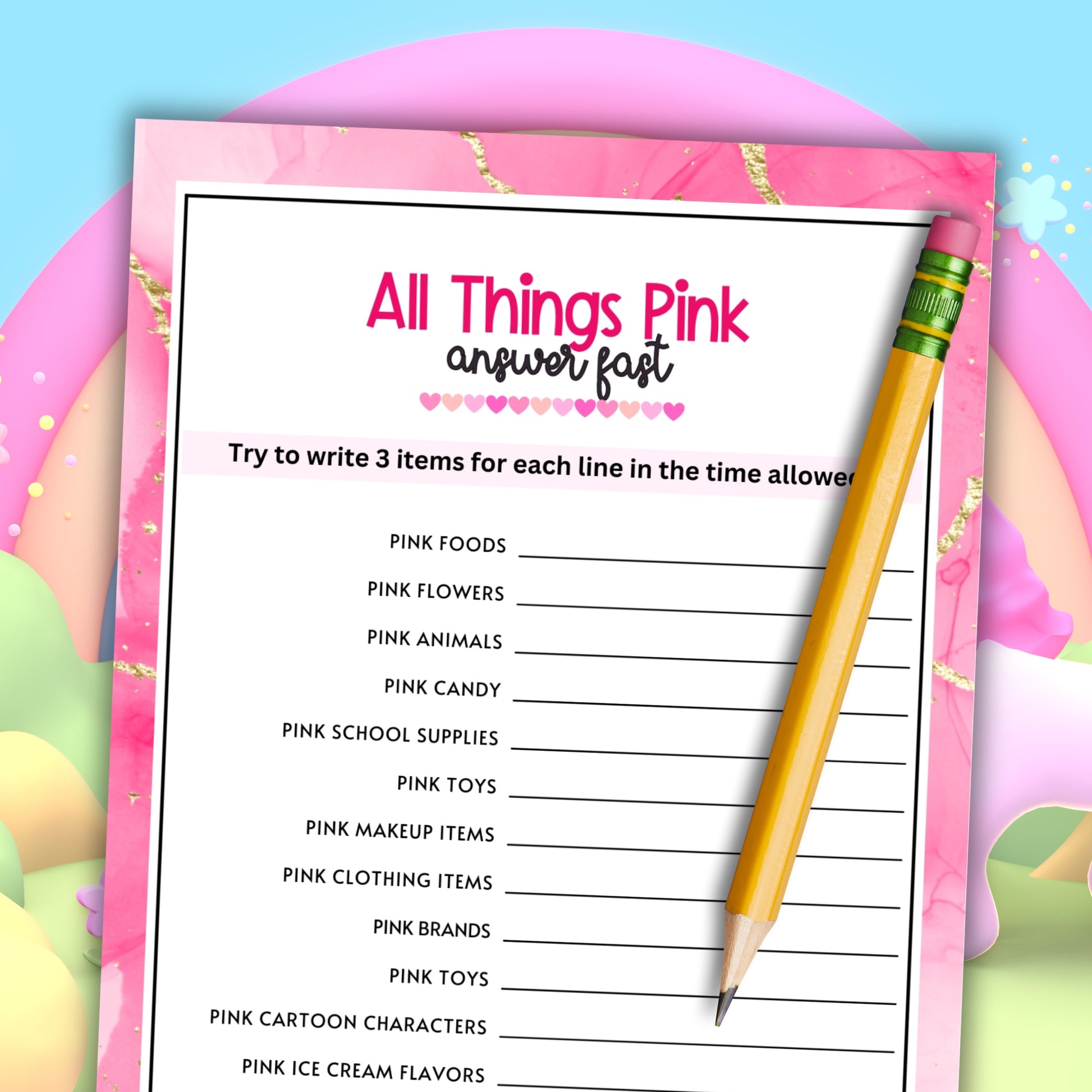 Participants are given a game sheet with several categories, all related to the color pink. The challenge is to quickly write down three items that fit each category. Think fast and jot down your answers before the time runs out!