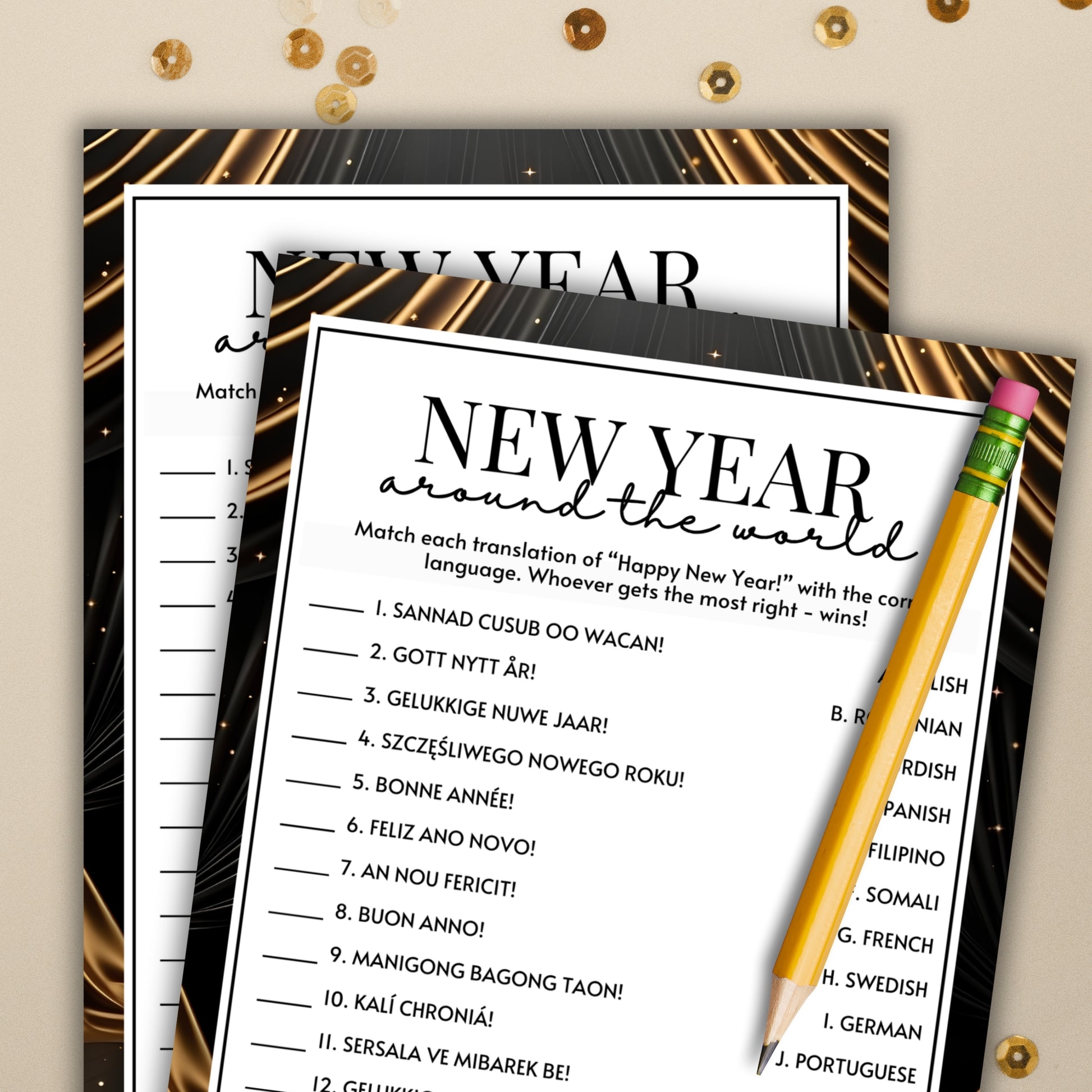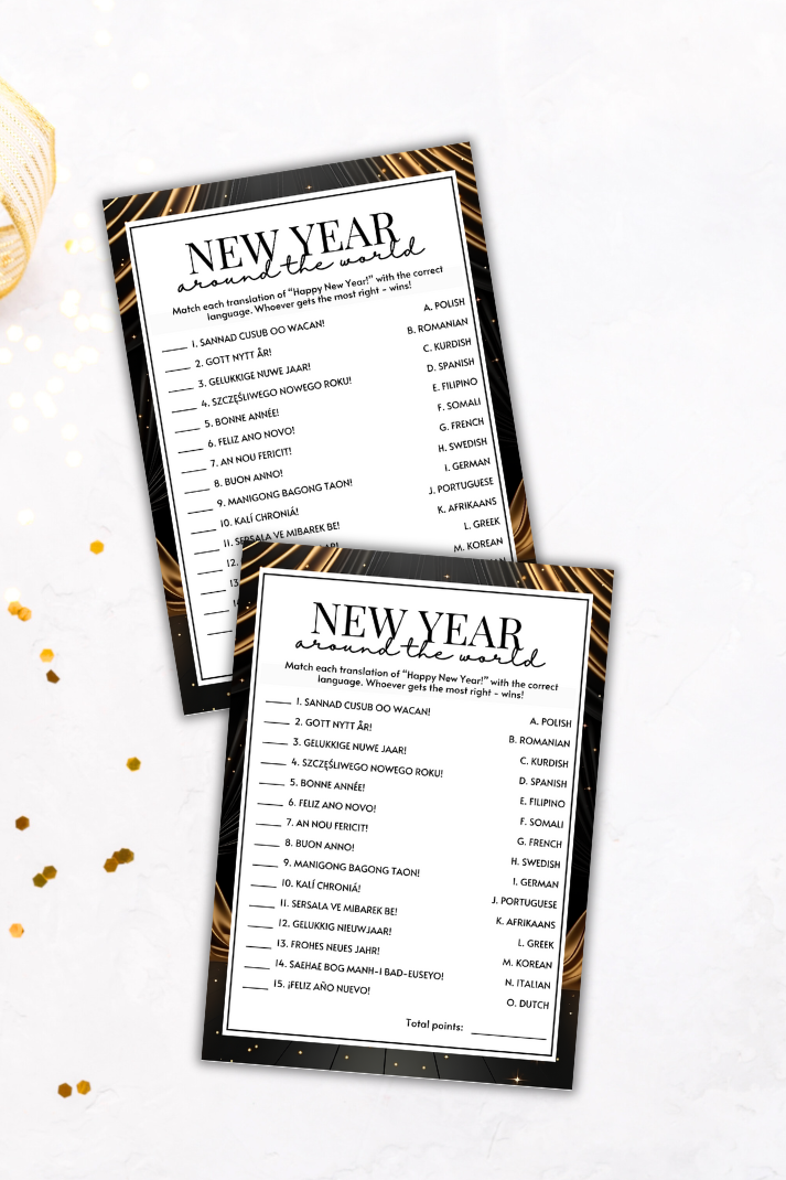 Make your New Year's Eve party unforgettable with this cute language translation game from Party Prints Press!