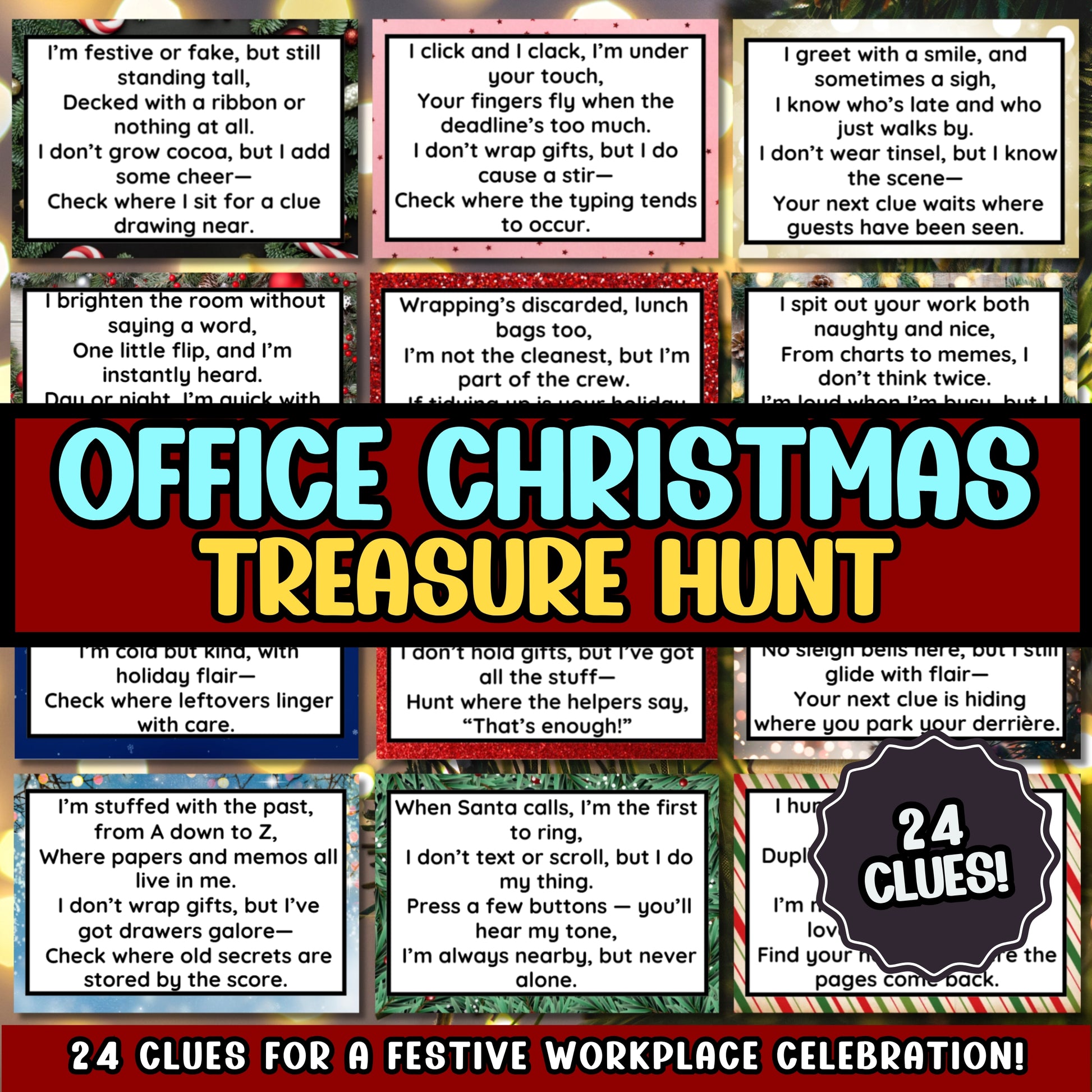 The holiday spirit is loose in the office... and someone’s hidden the treats! Follow the clues from the breakroom to the copy machine, solve the riddles, and track down the treasure before your coworkers beat you to it.