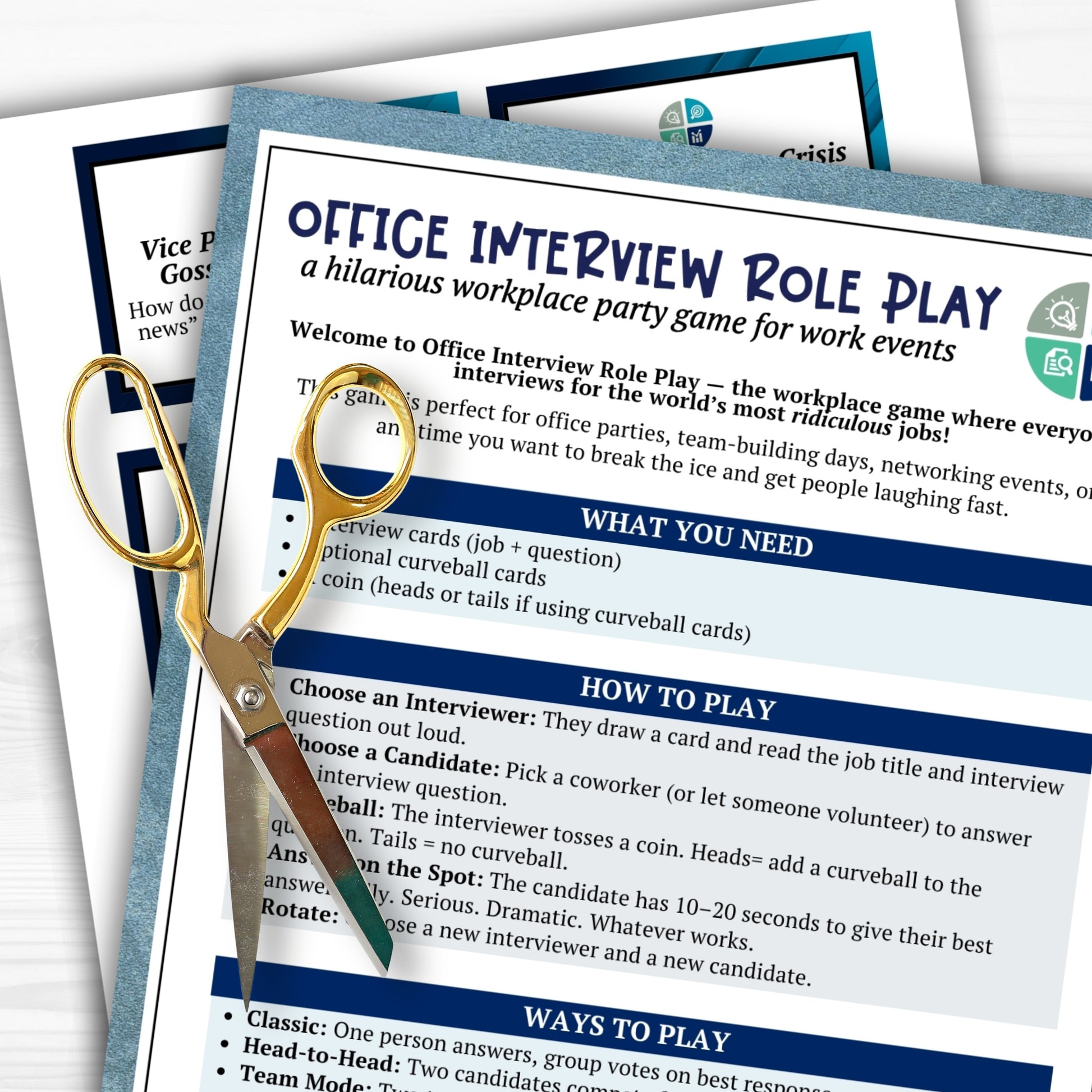 Players "interview" each other for ridiculous workplace roles, from Director of Office Vibes to Chief Meeting Avoidance Analyst, and answer improv-style questions on the spot.