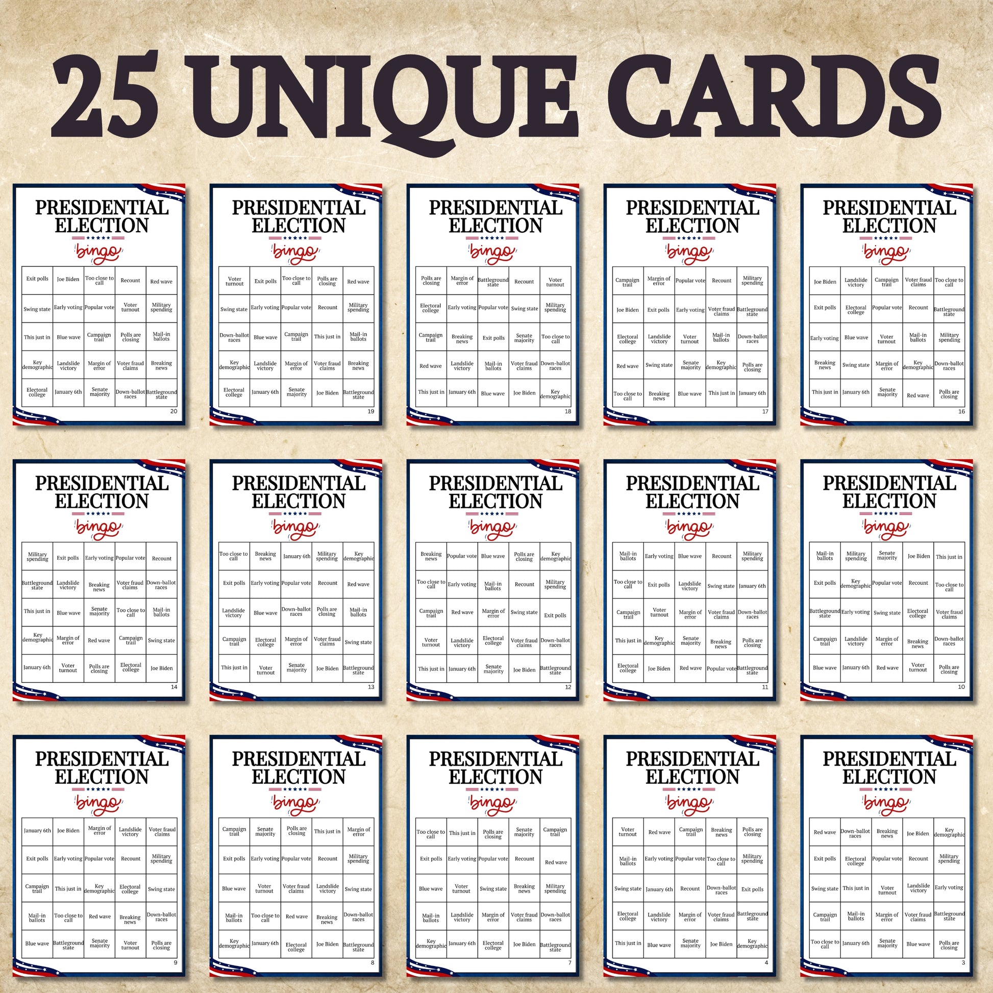 Looking for a fun and engaging way to enjoy election night with friends and family? The 2024 Presidential Election BINGO Game from Party Prints Press is the perfect print-and-play solution for hours of entertainment as you watch the results roll in!