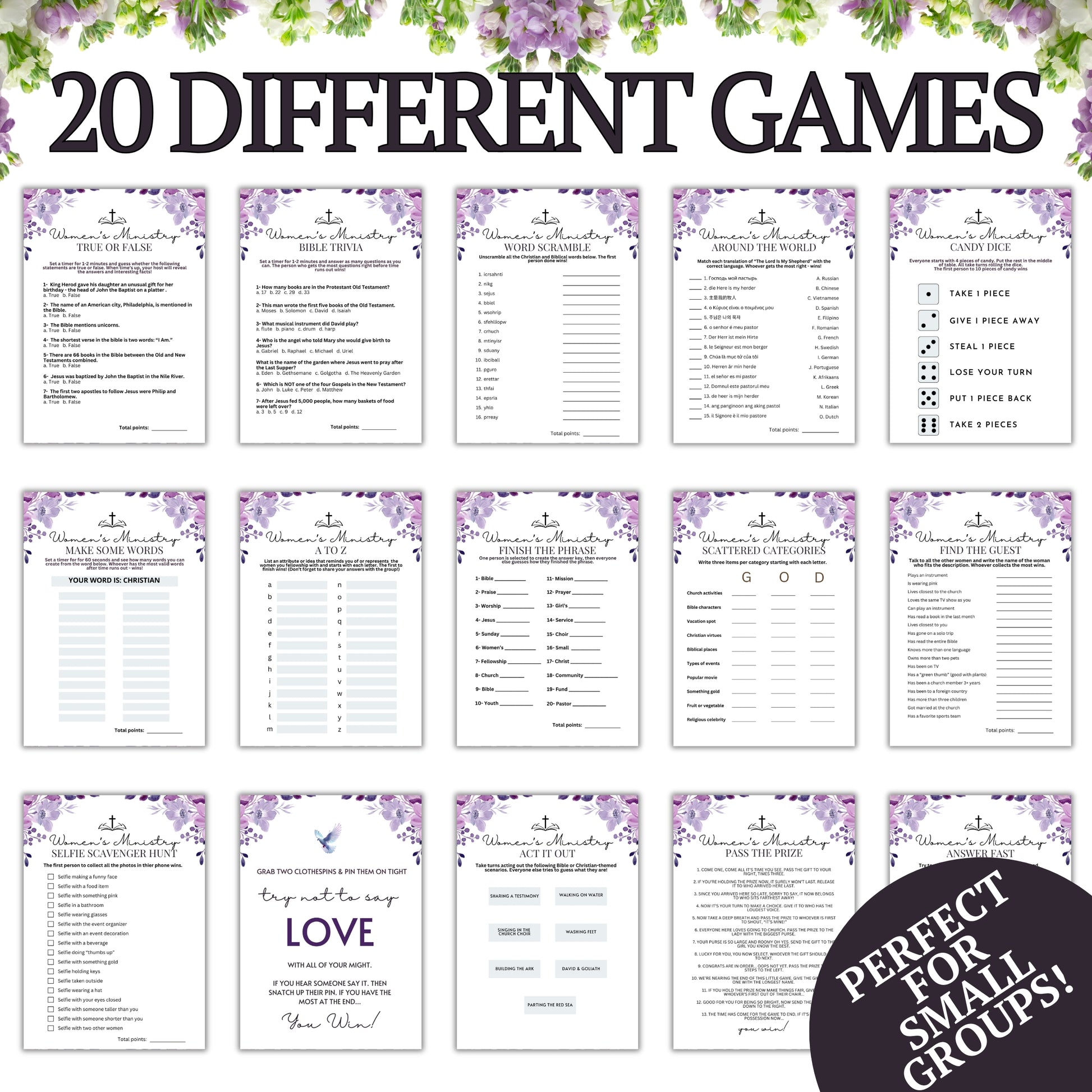 Make your Women's Ministry meeting, retreat, brunch, dinner, or special event more meaningful and memorable with this feminine, minimalist, and soft purple floral printable 20-game bundle of Bible and Christian games from Party Prints Press!