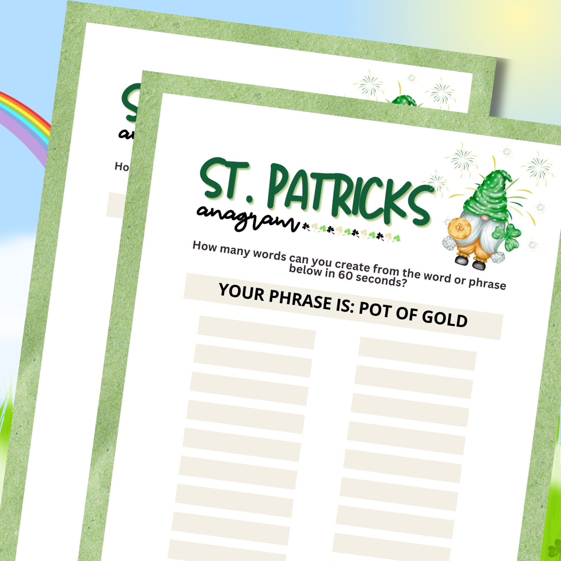 Looking for a fun and easy icebreaker game to play at your St. Patrick's Day party, work party, office event, book club meeting, pub crawl night, or dinner gathering? This fun and challenging anagram game allows friendly competition as guests race to create smaller words from the bigger phrase- "POT OF GOLD".