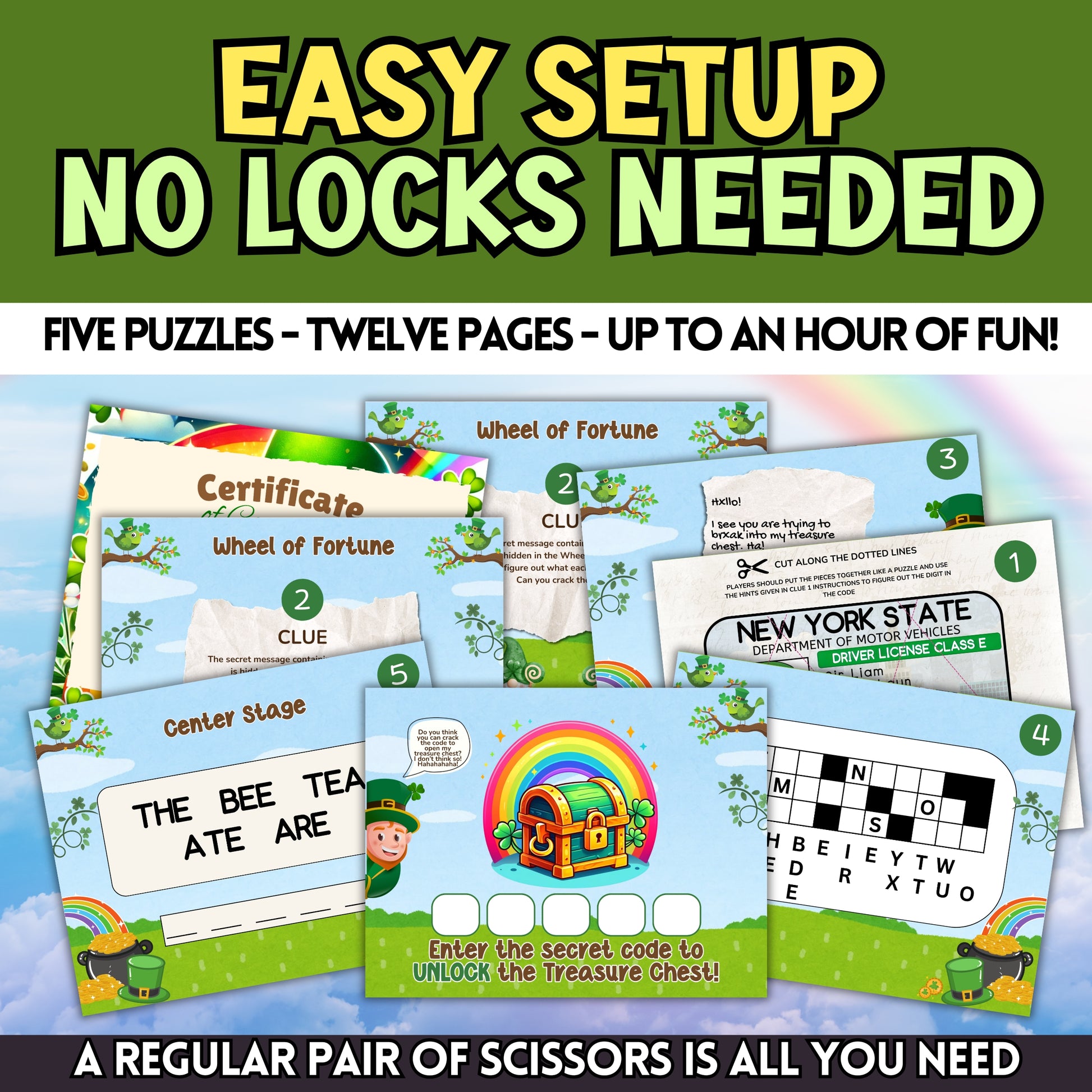 Here’s the storyline: Oh no! While visiting the magical clover field, the treasure chest filled with leprechaun gold was locked with a tricky 5-number code! Team up with your friends to solve the puzzles, find the clues, and crack the code before time runs out. Can you break the lock and claim the treasure?