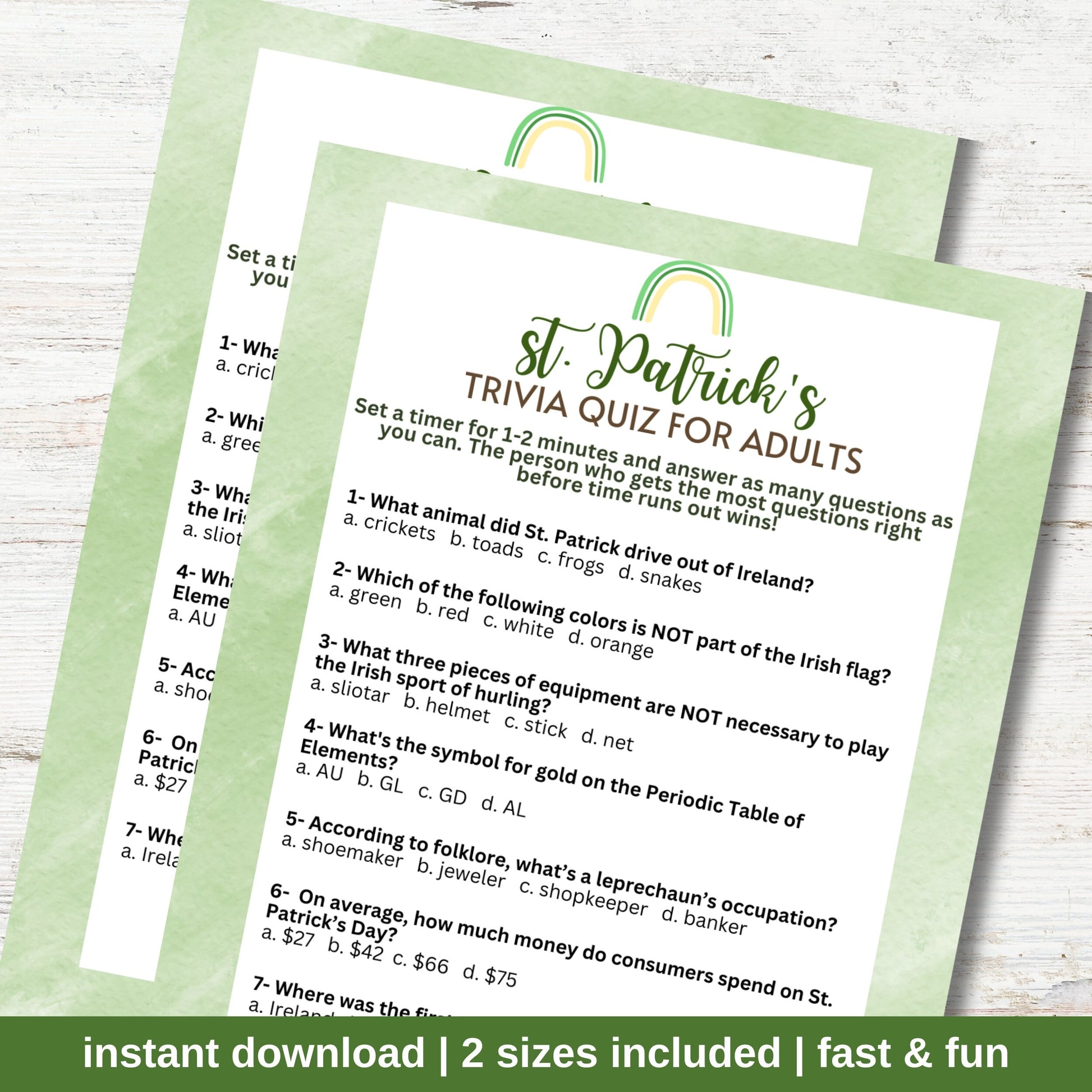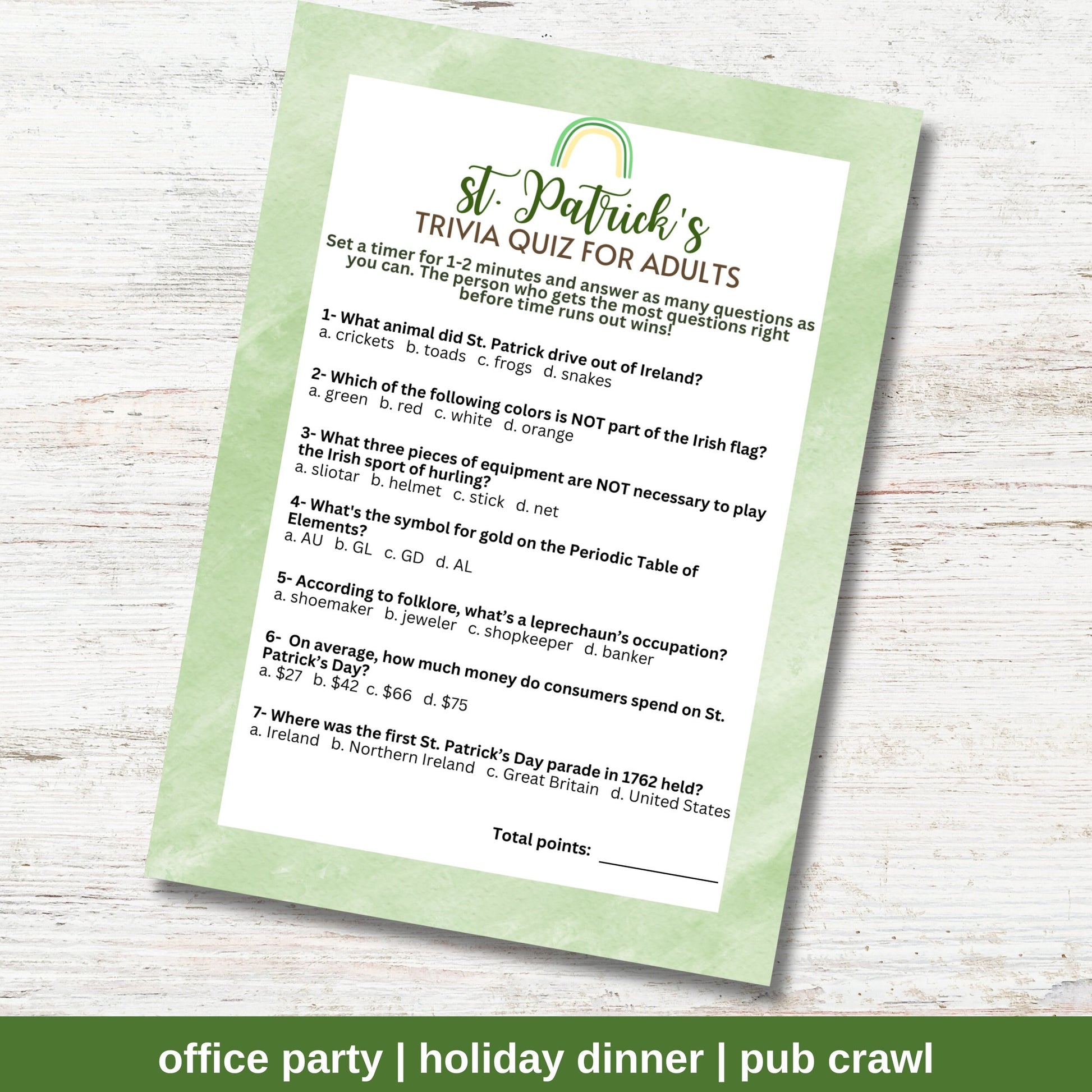 Looking for a fun and easy icebreaker game to play at your St. Patrick's Day party, work party, office event, book club meeting, pub crawl night, or dinner gathering? Play this Saint Patty's Trivia For Adults activity and see who wins!