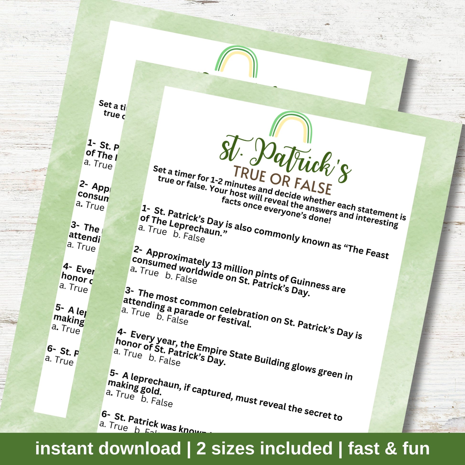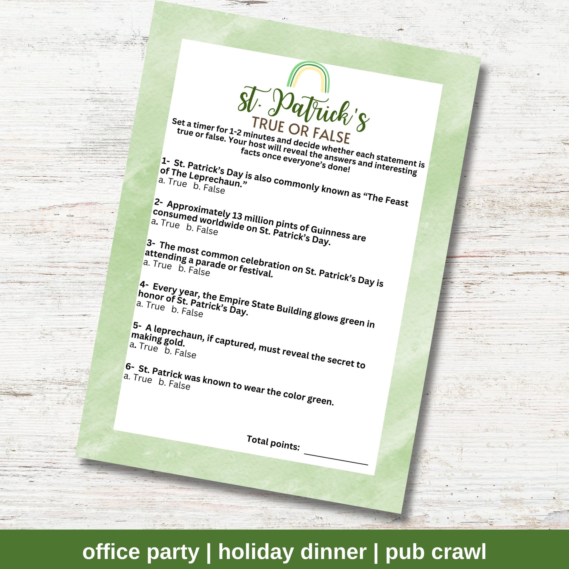 Looking for a fun and easy icebreaker game to play at your St. Patrick's Day party, work party, office event, book club meeting, pub crawl night, or dinner gathering? Play this Saint Patty's True or False trivia activity and see who wins!