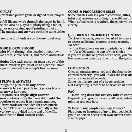 The puzzles are built around written materials, records, and systems that reward close reading rather than speed.