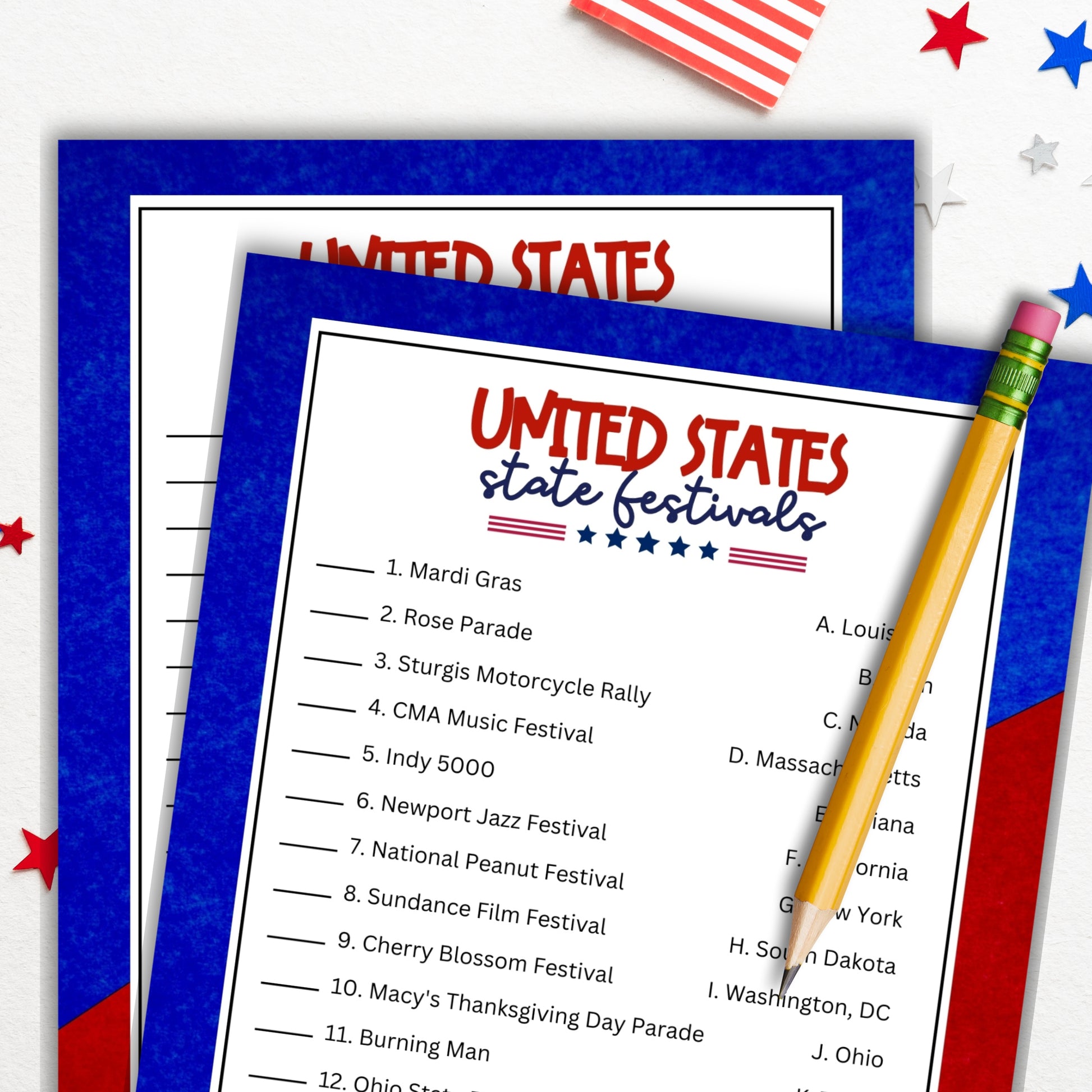 This trivia questionnaire, bright and colorful in patriotic red, white, and blue, will test everyone's knowledge of famous and popular festivals and events in different states across the USA.