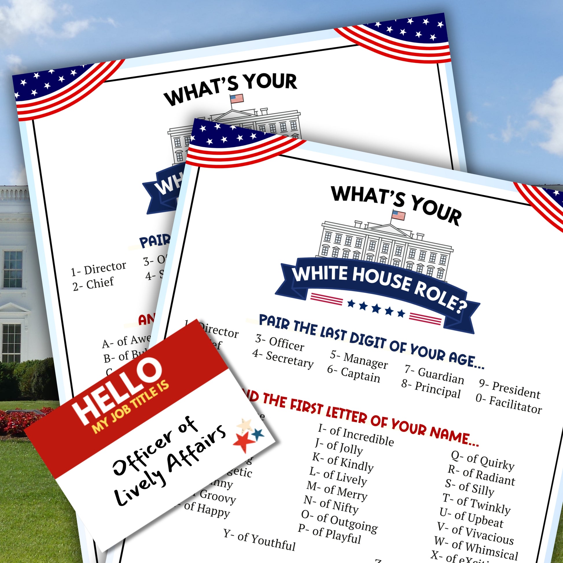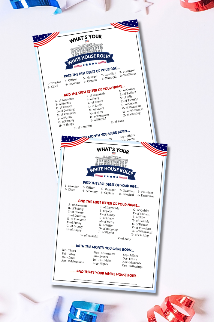 Whether you're gearing up for a 2024 Presidential Election Watch Party or want to educate and entertain kids at school on Election Day, the "What's Your White House Role Name?" game from Party Prints Press is the ultimate activity to get everyone involved in the democratic process!
